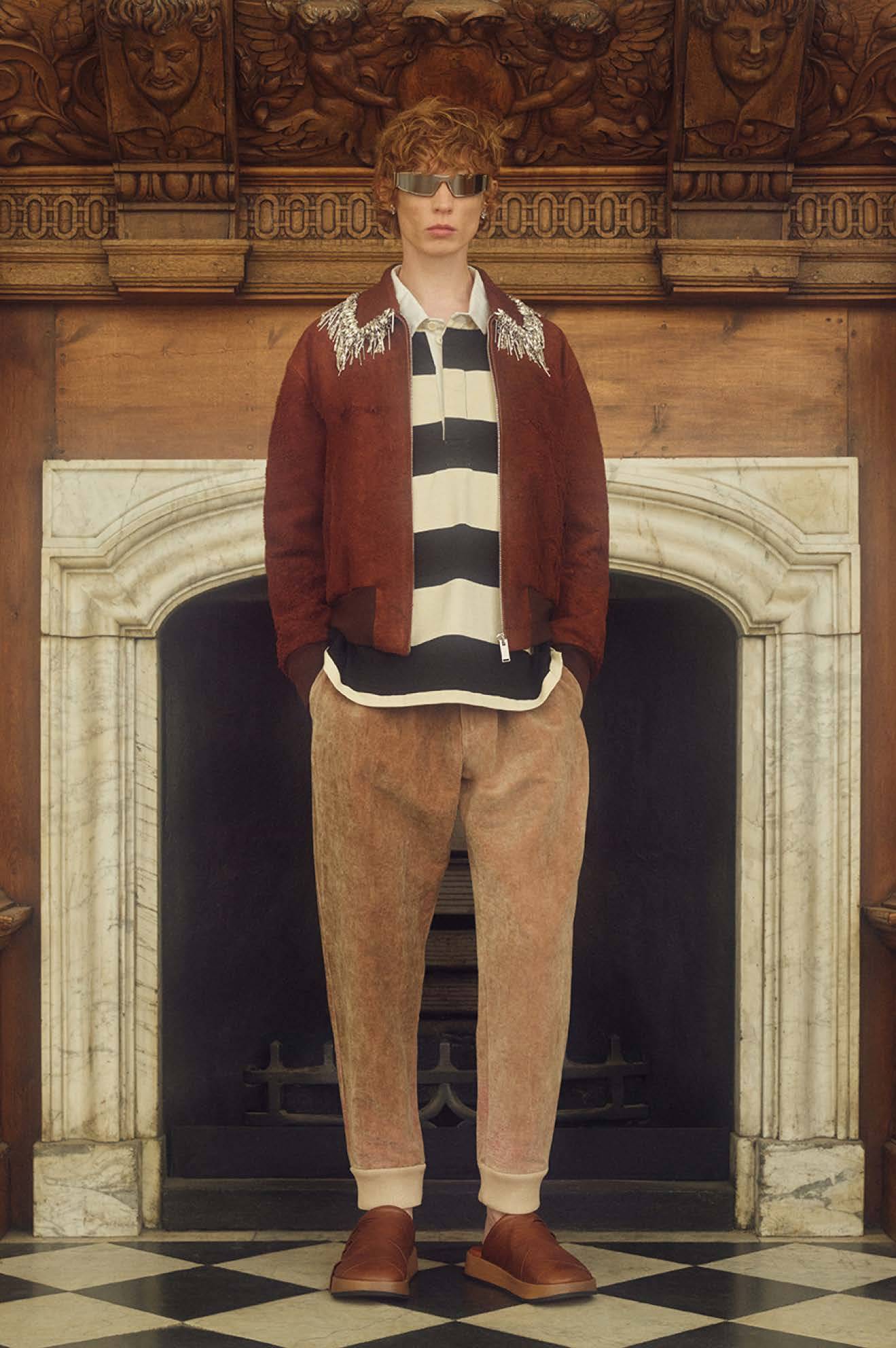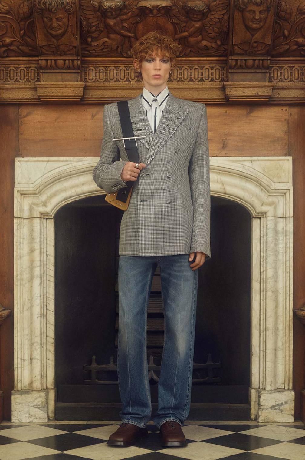 英式校服是一个出发点,贵族的内涵里融入了对不恭的把玩,紧身收腰的双排扣外套,工装剪裁里掺杂着格外醒目的慵懒感,衬衫领口几乎延展至肩部。McGirr称时装被设计成了中性化的物件,包括腰部折叠的长裤,柔软衬衫上的波西米亚荷叶边,短款开衫如缩水一般,纽扣之间拉扯出了空隙。“我喜欢不做改变的想法,”他解释道,“如果(根据性别)做出改变,就丧失了它的气场和派头。”
