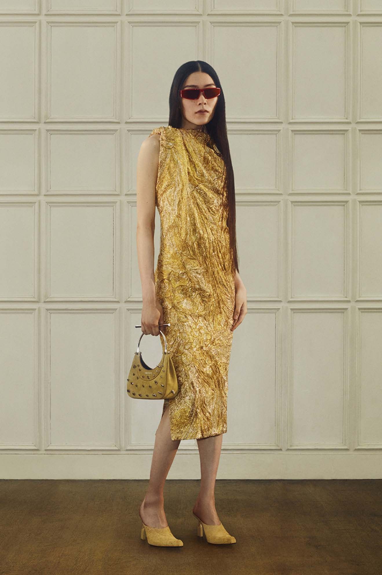 这一系列的印花是对委拉斯开兹画作《教皇诺森十世像》的再现,将其切片重组在睡衣风套装、不对称的垂褶裙以及仿钻装饰的高领女紧身衣上。McGirr是一位艺术爱好者,在纽约旅行的大部分时间都在画廊里度过,寻找隐藏在17世纪大师画作中的“彩蛋”。几个世纪之后,这一肖像画作启发了Francis Bacon的“尖叫的教皇”系列,Google搜索显示针对这幅著名画作的研究正在另一个位于伦敦的具有历史意义的英式宅邸Aspley House中进行。垂褶裙上,教皇诺森手中的信件被放在了正中的位置。McGirr想要借此传递什么样的信息?他回答说他仅仅是喜欢这样一个想法:派对上的女孩和男孩“将墙上的艺术品穿在身上。”