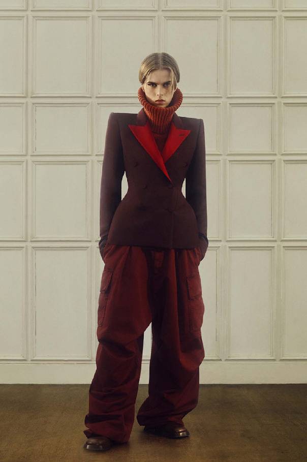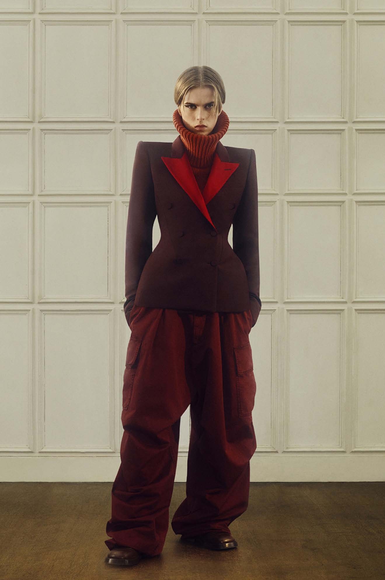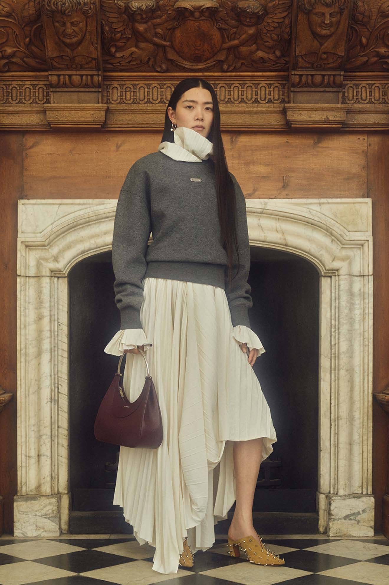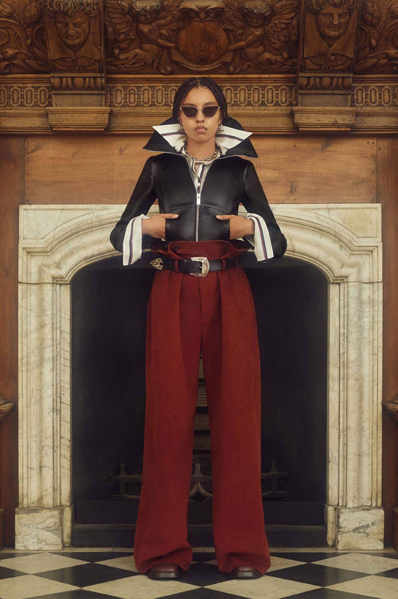 作为一个不设秀场的非主要季节系列,相较于2024秋冬系列首秀,该系列呈现出更加适合街头的,或者是更加适合府邸聚会的氛围。McGirr谈到这组大片的理念是“女孩男孩一起聚会,穿着对方的衣服。”聚焦剪裁以及日常穿搭中的点睛单品,如饰有立起来超过耳朵位置领口的毛衣、夸张饰裙之上的紧身比例皮夹克,以钉饰流苏刺绣装饰前方口袋的牛仔裤。T型金属扣饰则将朋克风的气质延伸至了手袋和鞋履。