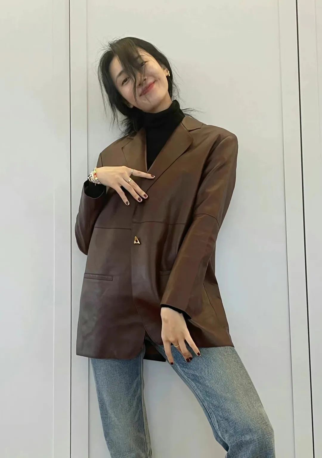 还会同穿一件棕色皮衣,保暖与飒爽兼备。