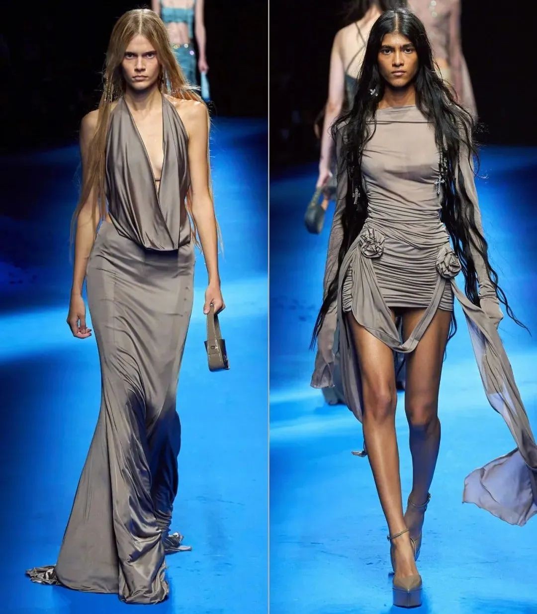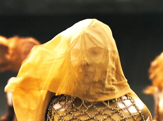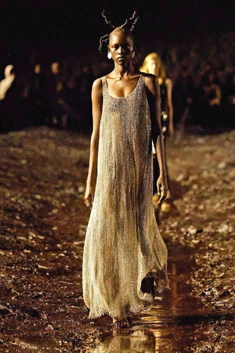 这场秀也让人忆起《沙丘》中公爵夫人头戴面纱出场的画面,面纱下的珠链与缎面礼服华丽呼应,与身处荒漠中肆意的大风形成冲击力,更为摄人心魄。