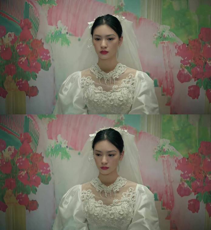 邱天长了一张极具故事感的脸,颧骨和下颌角线条清晰,清冷骨感,眼神里都是孤傲。所以在这样繁复的钉珠婚纱、粉色调背景下,她有一种遗世而独立的抽离感,让这一帧画面有了更多解读空间。