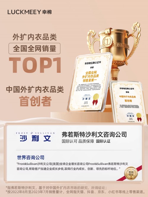 以章若楠上身的“幸棉外扩内衣”为例,这是幸棉耗时近一年研发推出的首款产品,也是品牌成功打造的第一款爆品。这款产品聚焦穿搭有曲线感需求的人群,以满足自然显大、视觉上显腰细的穿搭效果。自2021年上市至今,因产品自带“漫画胸”、“内衣界早C晚A”等热梗属性,掀起全网时尚穿搭和种草热潮,成为天猫、抖音等渠道的年度趋势爆品,并获得世界顶级咨询公司沙利文“中国外扩内衣品类首创者”和“外扩内衣品类全国全网销量第一”的权威市场认证。