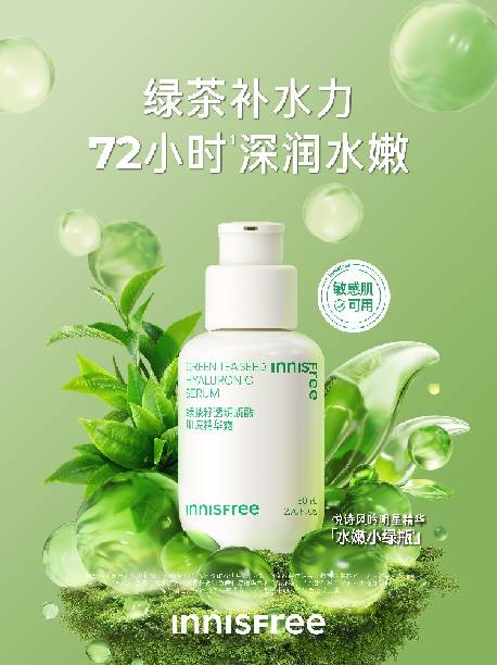 悦诗风吟明星精华水嫩小绿瓶【1】中除了品牌为肌肤专研的补水保湿的水嫩绿茶【4】成分,还添加了植粹玻尿酸微囊【5】,能为肌肤快速有效补水,使其补水能力提升224%【6】。更搭配有十年专利的绿茶乳酸菌【7】成分,可48.81%【8】强韧肌肤屏障,为肌肤保驾护航。同时,产品肤感水润清爽不粘腻,快速吸收,深润肌肤,使用72小时【9】后肌肤仍拥有水润状态,无惧干燥和泛红让消费者获得水嫩肌肤。同时配方温和的水嫩小绿瓶【1】,没有添加酒精以及包含人工香精在内的12大致敏成分【10】天然来源指数91.1%【11】,敏感肌也能使用。