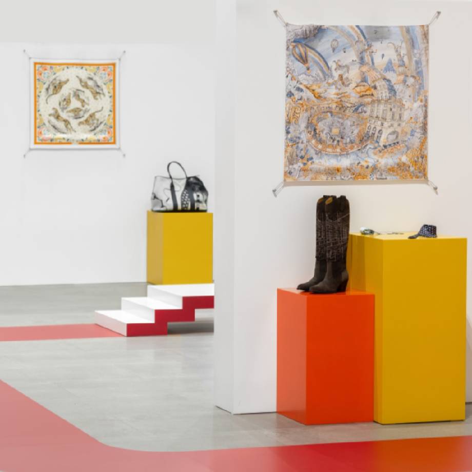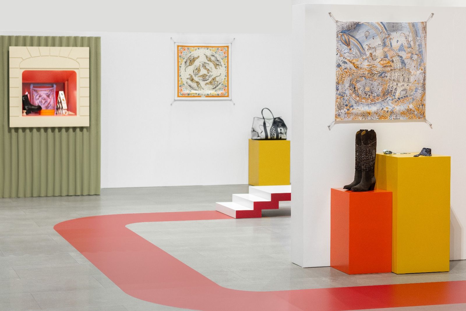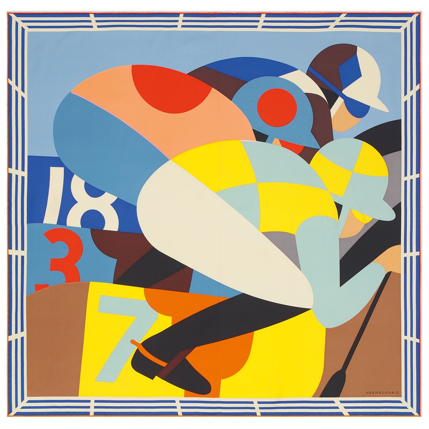 于静态凝练动感,加拿大艺术家 Geoff McFetridge 运用几何图案与鲜艳色块,生动刻画三位骑师策马竞速的激情瞬间,骑师与爱驹默契配合,三组强劲搭档棋逢对手,引领观者重回精彩纷呈的运动现场,身临活力澎湃的精彩时刻。而更为惊喜的是,马背所饰数字恰好组成爱马仕的创立年份1837 年,仿佛时光折叠,溯回穿游至今的难忘时光。