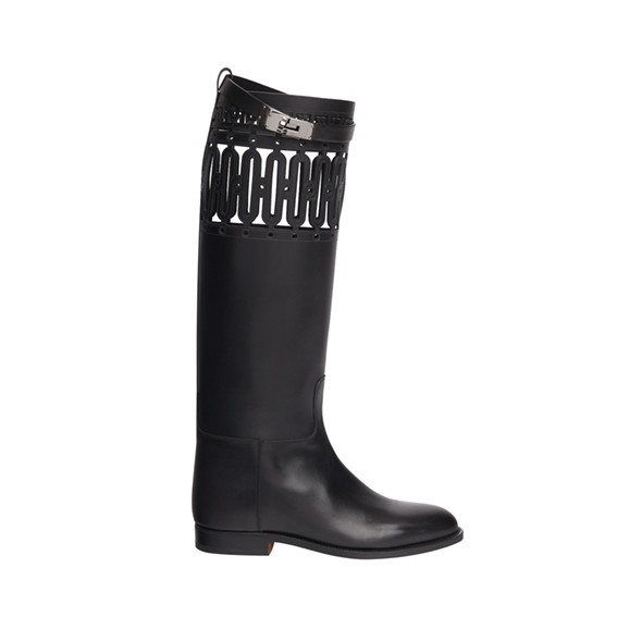 皮革与手工艺的对话,打造新意迭现的沉稳步调。经典Jumping 长靴轮廓孕育福宝经典,深邃而富有光泽的小牛皮仅以繁简得当的线条便勾勒出恰如其分的回溯表达,标识性Kelly 搭扣与福宝栏杆几何镂空相映成趣,通过优雅新绎,致敬福宝精神。