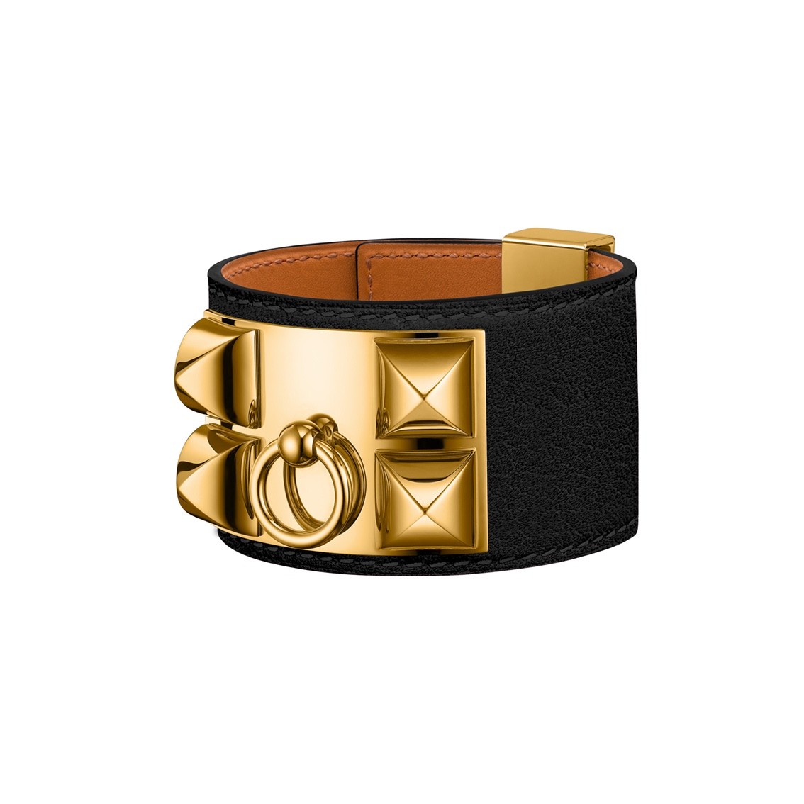 再现黑金经典,Médor 饰钉与金属圆环并置形成鲜活的对比,于腕间开启经典元素的焕新姿态,优美弧线淋漓展现精湛匠人工艺。Collier de chien 原是为了保护猎犬而设计的颈圈,却一举成为 1920 年代经典的时尚物件。爱马仕先将其演变为腰带,随后从 1949 年起演绎为首饰,Médor 饰钉也成为品牌的象征性设计。