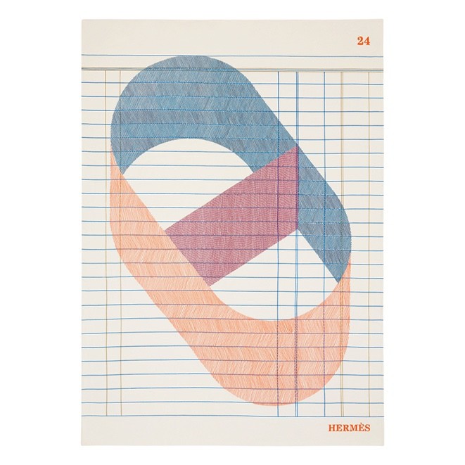 柔软细腻的羊绒毛毯宛如笔记本中散落的纸页,其上绘有美国艺术家 Albert Chamillard 以圆珠笔勾勒的 Chaîne d'Ancre 锚链图案。手工刺绣匠艺与珠饰灵动烘托精准线条,营造耐人玩味的立体感与透视感。角落缀以刺绣数字 "24",正是对爱马仕巴黎福宝大道 24 号总店的巧意致敬。