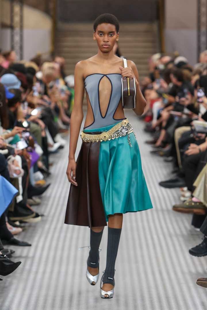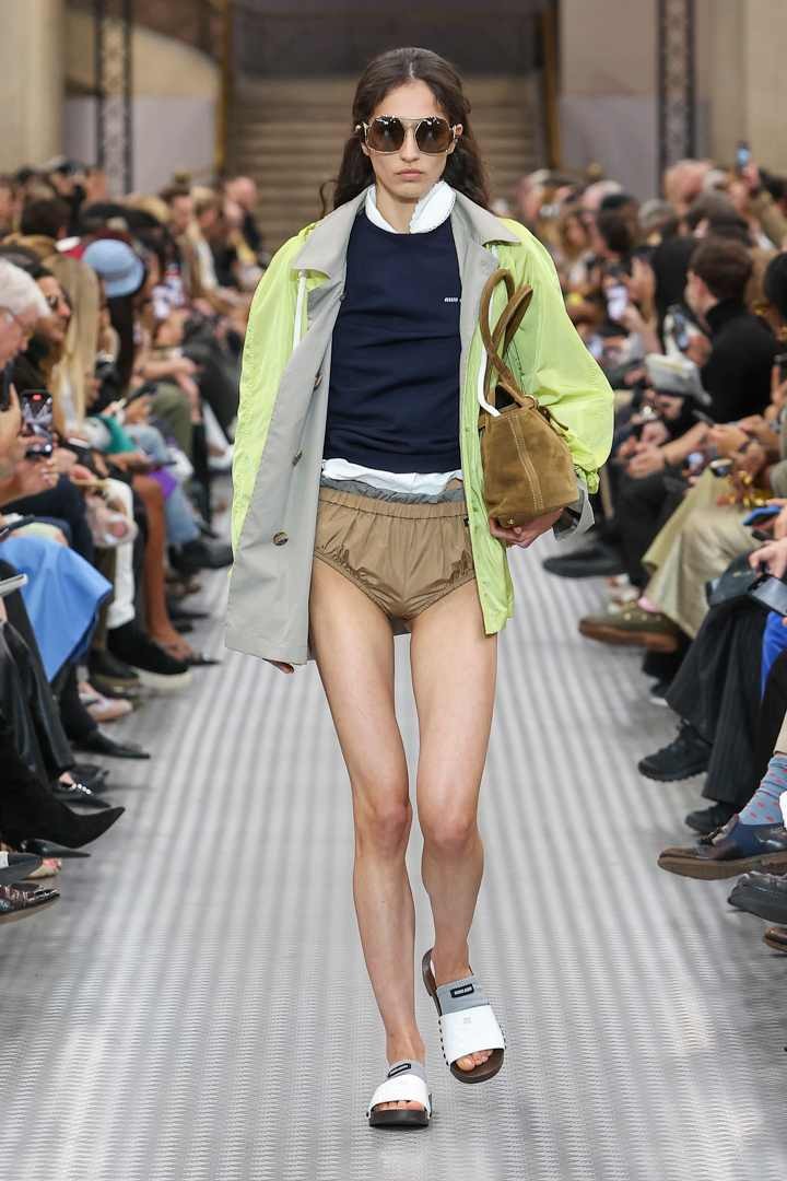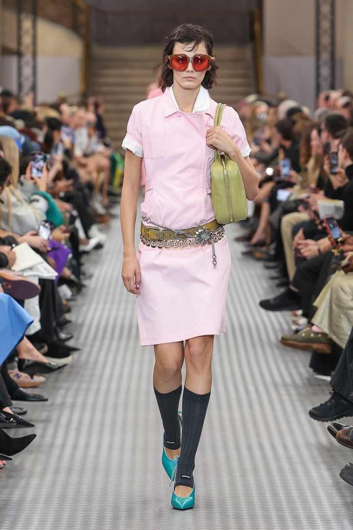 元素在冲动感中被移植和组合。事物变得不同,位移改变用途,继而改变了真相。元素在不同单品之间转换,看似尼龙的单品其实是丝绸。经典单品则与之形成鲜明对比,强调了对常态的操纵。新的元素还强调了作为其自身已确立作品的Miu Miu美学——真正的Miu Miu制服,过去逐步确立,如今已完全实现。